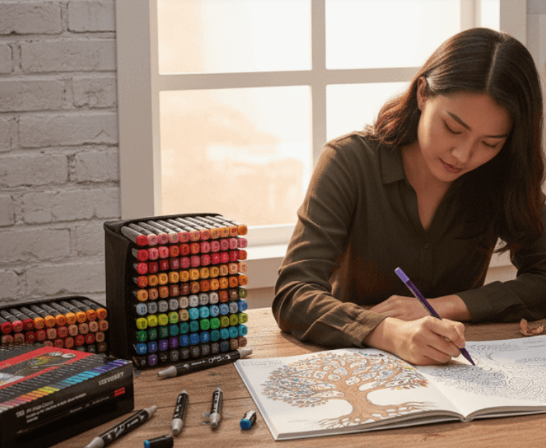 O conjunto de canetas marcadoras de ponta dupla 120 cores, por exemplo, pode ser ideal para quem busca precisão e versatilidade criativa. Suas duas pontas — uma fina e outra chanfrada — permitem desde traços detalhados até preenchimentos amplos, com tinta à base de álcool que seca rápido e garante um acabamento limpo e profissional. A ampla paleta de cores oferece liberdade para criar efeitos de sombreamento e degradês, sendo perfeita para ilustrações, design, moda e arquitetura.