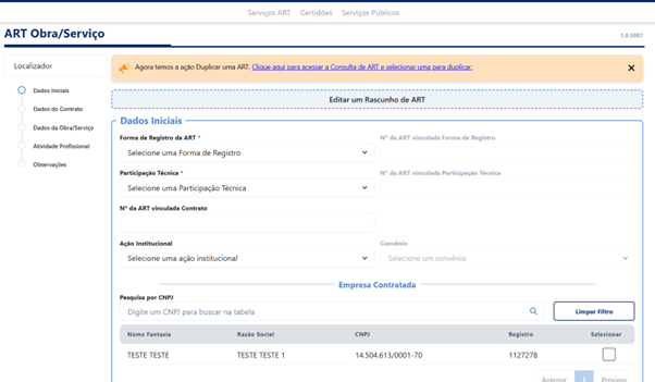 Tela de edição de rascunho de ART