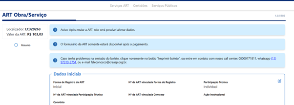 Exibição do valor da ART no preenchimento